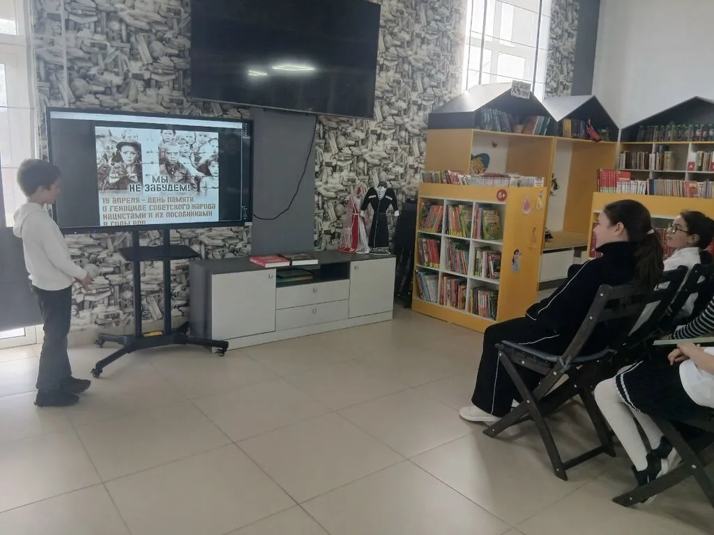 Библиотекарь рассказала школьникам о трагедии войны, преступлениях нацистов в концлагерях и политике геноцида против мирного населения. Она представила исторические факты и архивные документы, подтверждающие масштаб трагедии.